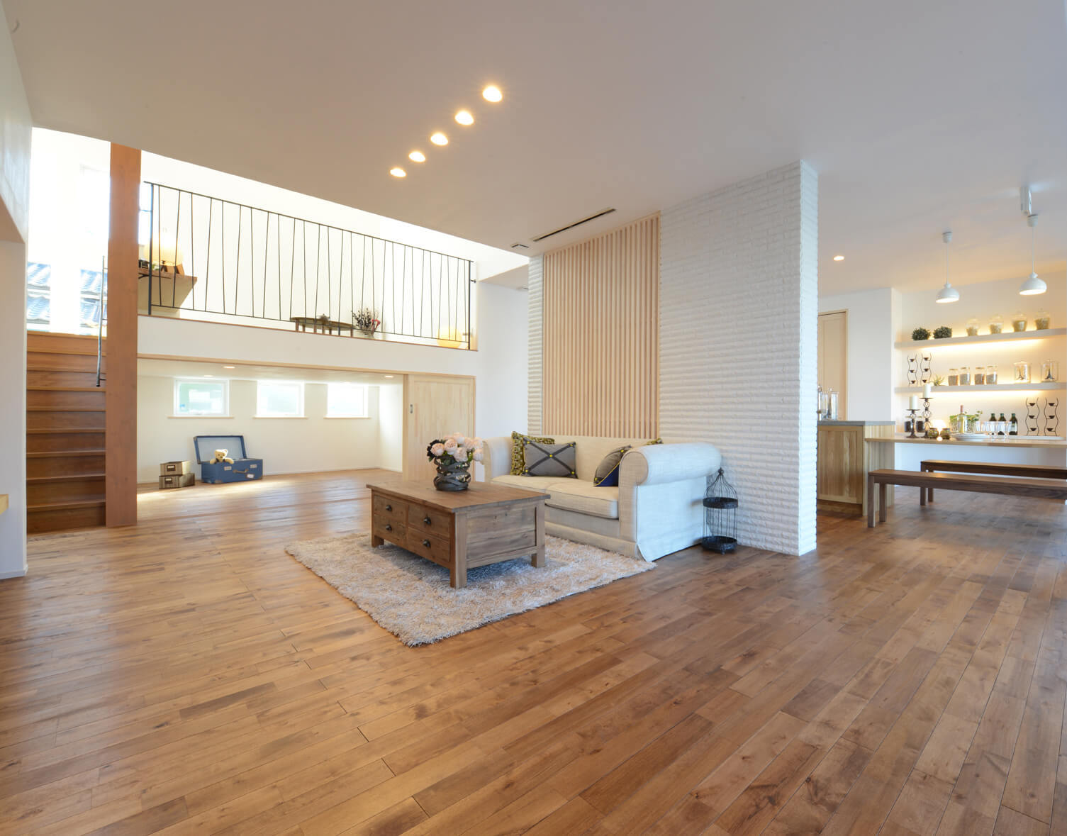 スキップフロアが魅力のリビングルーム 二階分の高さを確保した吹き抜け空間とスキップフロアが特徴です。広がりを感じられるため、実際の面積以上にゆとりのあるリビングになっています。スキップフロアは、家族の気配を感じながらも程よく空間を分けられるのが魅力。 お子さまの遊び場やワークスペースなど、暮らしに合わせて多目的に活用できます。